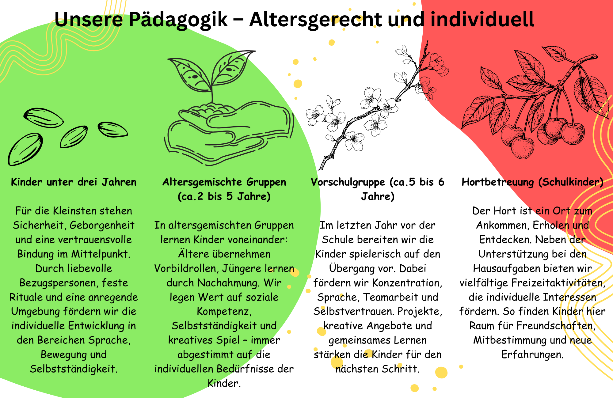 Wir begleiten Kinder in unterschiedlichen Altersgruppen mit gezielter pädagogischer Förderung, die auf ihre Entwicklung abgestimmt ist. So schaffen wir für jedes Kind den passenden Raum zum Lernen, Spielen und Wachsen.
