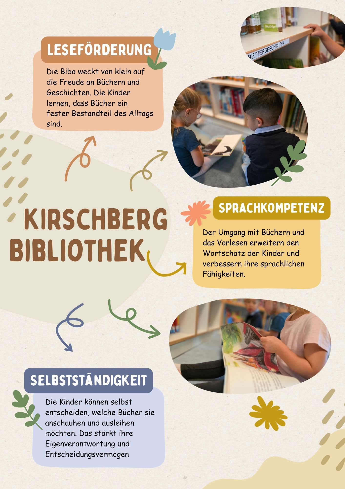 Die Bücherei ist für uns ein wichtiger Bildungsort innerhalb der Kita. Hier werden sprachliche, kognitive und soziale Kompetenzen ganzheitlich gefördert: Kinder erweitern spielerisch ihren Wortschatz, lernen Geschichten zu verstehen und entwickeln Freude am Lesen und Erzählen. Durch die große Auswahl an Büchern und Materialien können sie selbstständig wählen, was sie interessiert – und übernehmen so Verantwortung für ihr Lernen.